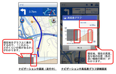 今回新機能を追加したのはAndroidアプリ版。これまで、検索結果としてルート高低差グラフを表示する機能はあったが、ナビゲーション中に表示されるようになった。グラフ内のどの位置を走行しているかも明示されるので、ペース配分の調整などに役立てられるという。